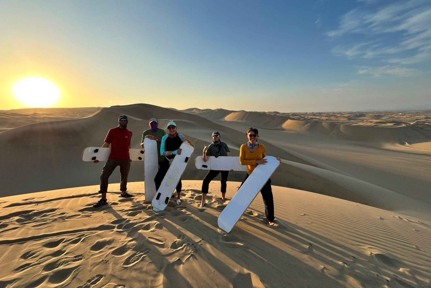 Gør dig klar til en oplevelse fuld af adrenalin og imponerende landskaber på vores buggy- og sandboarding-tur i solnedgangen. Eventyret begynder med en spændende tur i buggy gennem de vidtstrakte klitter i ørkenen. Du vil mærke spændingen, når du kører op og ned ad sandbjerge, med strategiske stop for at nyde udsigten og tage spektakulære fotos.