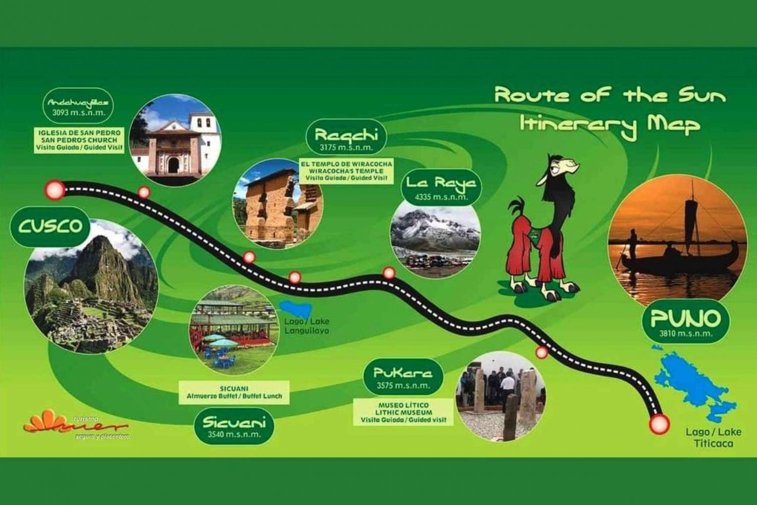 Der Service wird in Bussen angeboten, die speziell für Touristen ausgestattet sind, die den besten Weg suchen, um zwischen Cusco - Puno oder Puno - Cusco zu reisen, wo die Passagiere verschiedene Orte mit magischem Charme und uralter Geschichte genießen können, wie z.B: Die Sixtinische Kapelle Amerikas oder Andahuaylillas-Kapelle, der imposante Tempel des Gottes Wiracocha, der majestätische Paso de la Raya (Straßengrenze zwischen Cusco und Puno - Blick auf den Nevado Chimboya) und das mythische Lithic Museum der Pukara-Kultur.