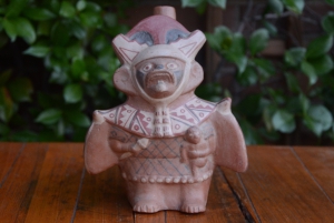 La cultura Moche se desarrolló desde el año 100 hasta el año 800 d.C. Una cultura basada en el poder religioso - sus grandes señores y sacerdotes tenían una "línea directa" con los dioses - que extendió sus territorios gracias a esta forma de control y prosperidad económica. Su dios principal era Ai-apaec, el creador del Universo, que era representado de muchas maneras pero siempre con colmillos - el jaguar-puma, dios terrenal - y serpientes - dios del inframundo. Fue a través de la fusión del hombre con los animales como lo mostraron otras deidades: el hombre-zorro como el soldado, el hombre-lobo como el sacerdote, el hombre-iguana como la muerte -porque crea sus nidos bajo tierra, en el inframundo-, etc.