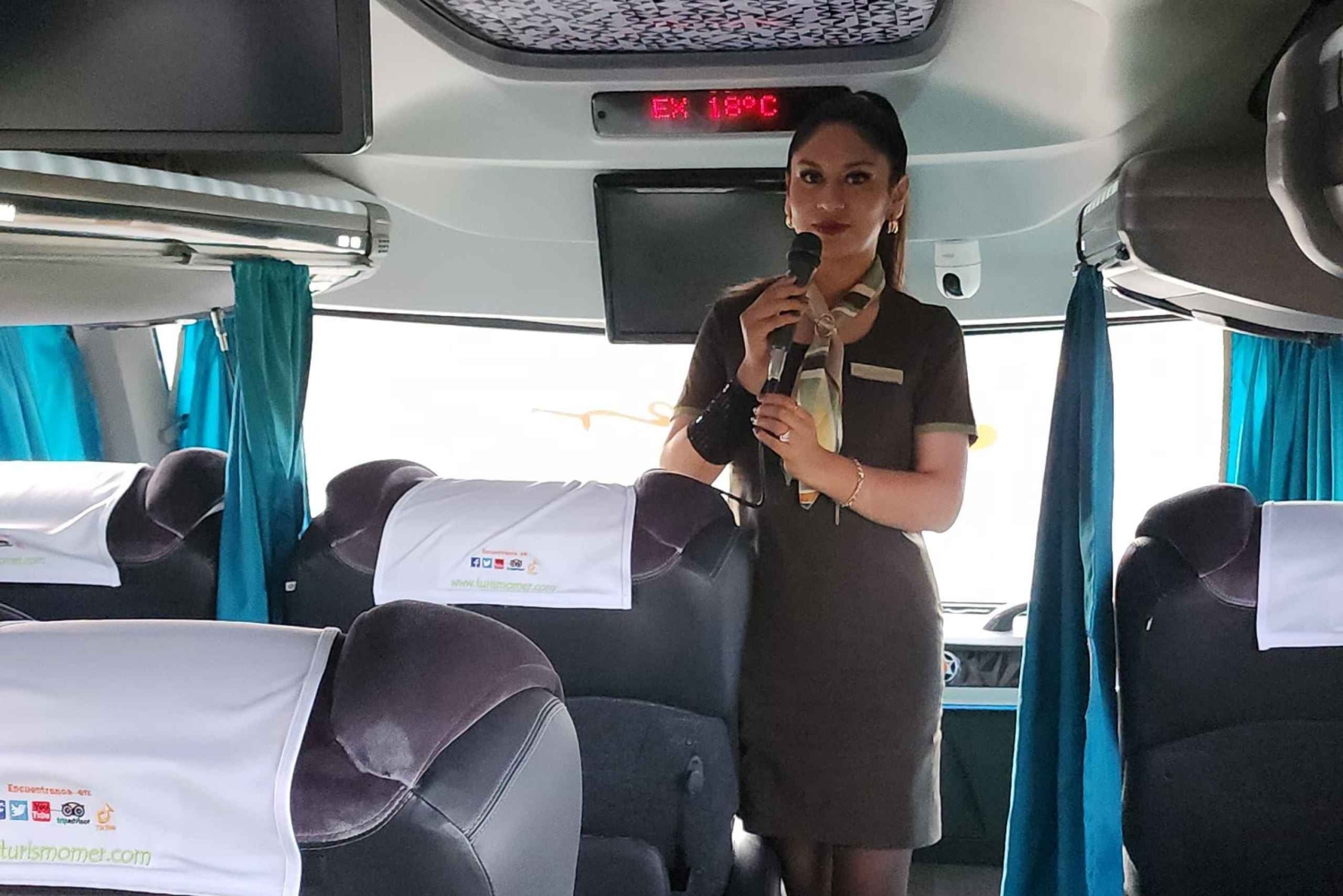 Tourist transportation from Puno to Cusco, departing at 07:00 am and arriving at 05:30 pm to Cusco, visiting tourist sites, including a buffet lunch and a snack on board.