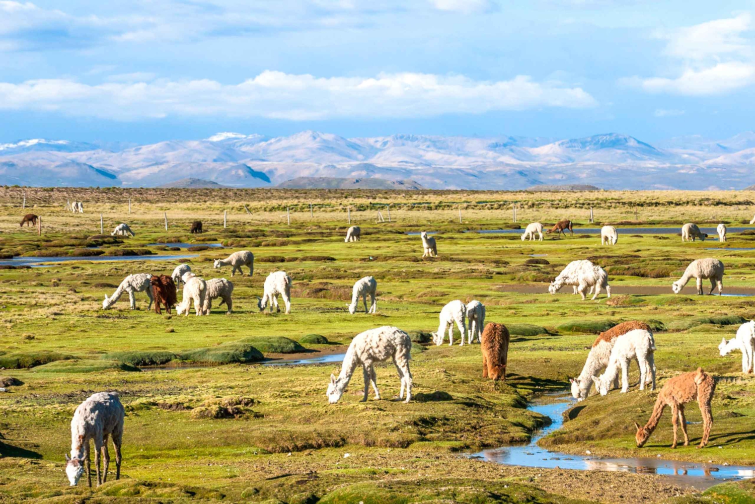 I'll pick you up at 3 am from your hotel in Arequipa, then we'll travel for 3 hours to reach Chivay for breakfast and then begin the activities: visiting the Colca Canyon, condor watching (depending on the season), with a 1-hour walk along the canyon rim, followed by a visit to the Yanque hot springs, then returning to Chivay for lunch and the return trip to Arequipa with stops at a high point of 4900 meters to see the Andean mountain range and the llama and alpaca habitat national reserve. The tour wraps up around 5 pm near the Plaza de Armas.