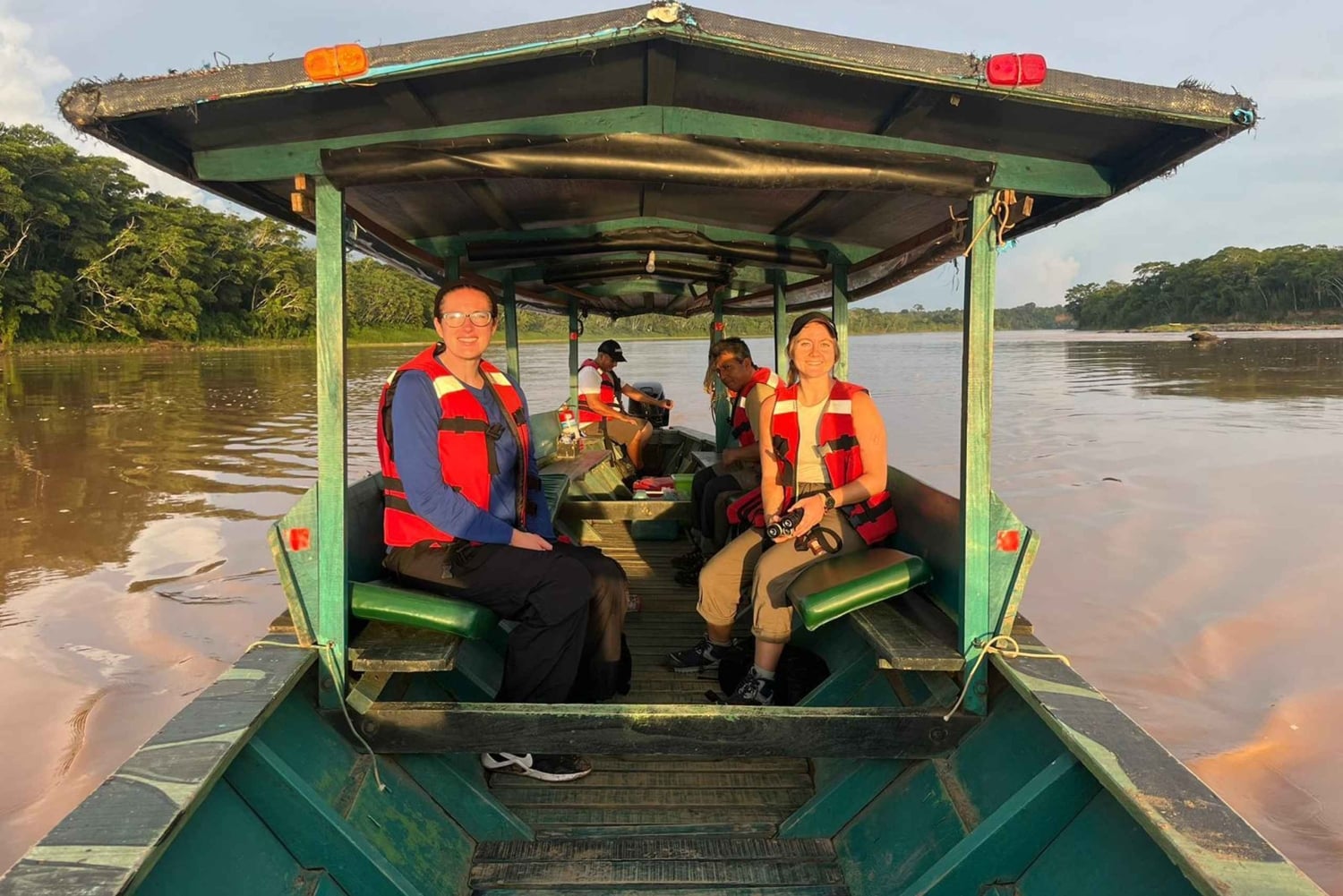 After lunch we will navigate the Tambopata River where we will see a great sunset and at dusk we will go down with the engine off in search of alligators and wild animals.