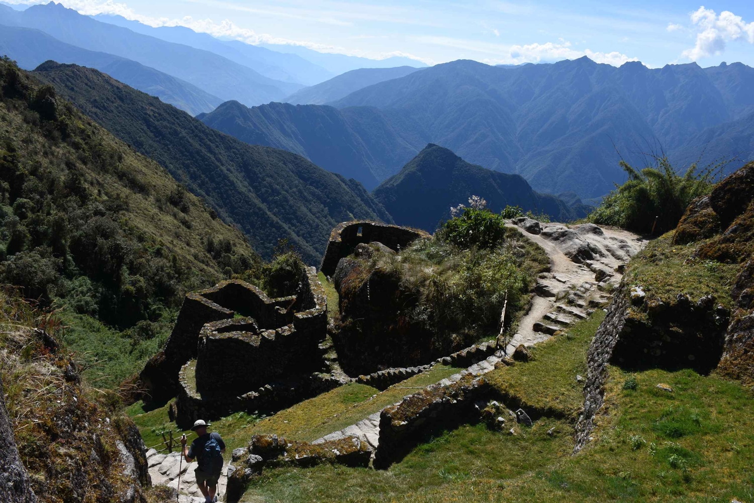 Today you ascend again to a second pass, about halfway up lies an Inca ruin of Runkuraqay, after a short tour, you continue up the pass. From here the group walks down on the original Inca Trail, passing a small lake and the first signs of the cloud forest. Soon after you will arrive at a second, larger Inca site called Sayacmarca a beautiful location overlooking the Aobamba Valley. After touring you continue along the ridge through amazing landscapes, viewing Mt. Salkantay from the western side and Mt. Pumasillo, a silhouette to the north on the horizon, your lunch stop. After lunch you continue walking through a rolling flag stoned trail and a tunnel before arriving to yet another Incan site called Phuyupatamarca “the village on the edge of the clouds.” From here the flag stoned trail winds sharply down into the cloud forest to the ruins of Wiñay Wayna “Forever Young”- a well restored Inca Ruin. The campsite is here for the night.