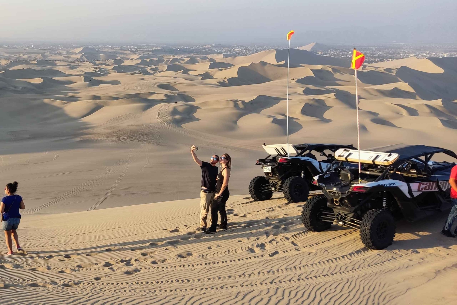 Feel the rush of riding a Can-Am Maverick through the dunes at sunset Sandboard from the heights and capture unique views of the oasis. A premium adventure in the Peruvian desert!
