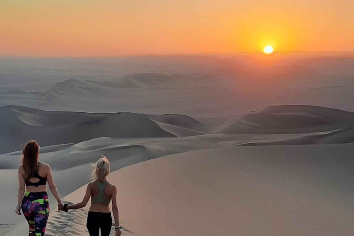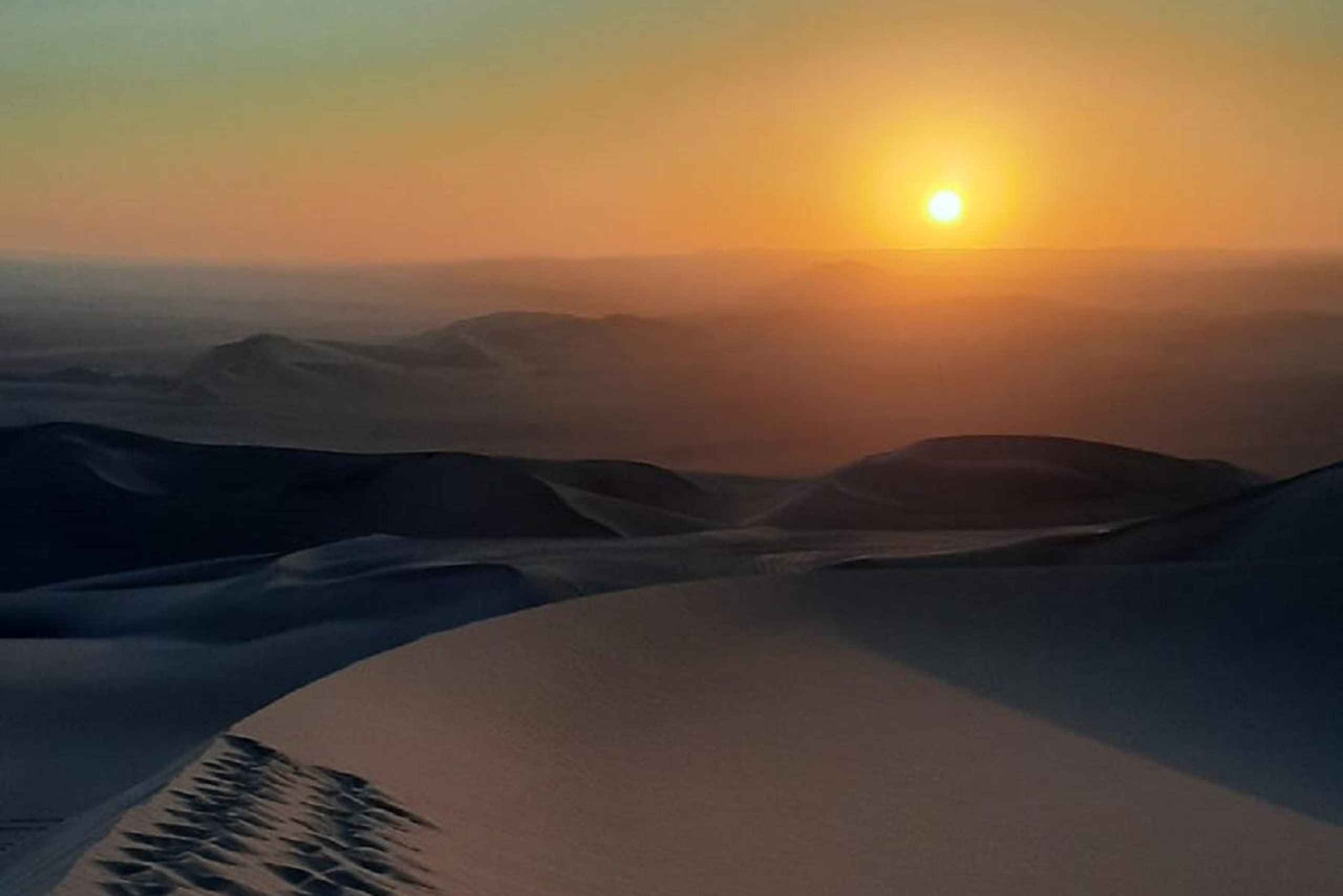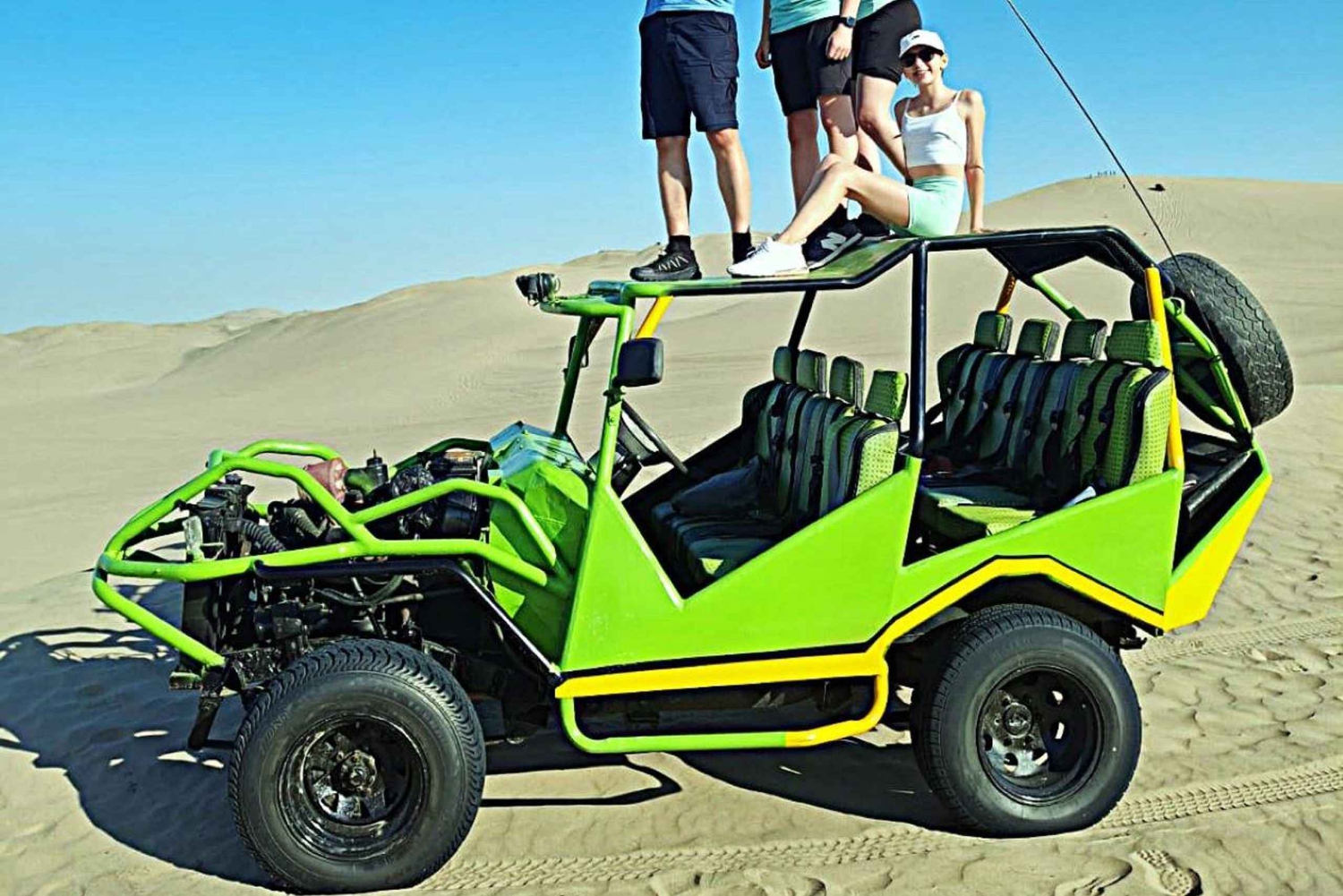 Adventure, buggy, adrenaline, sandboarding, and sunset in Huacachina. At 4 pm, we board our buggy to explore the giant sand dunes beyond Huacachina. We will climb up and down beautiful sand dunes and practice sandboarding over and over again. Finally, we will go to our favorite dune to wait and enjoy an unforgettable view of the sunset, taking lots of photos and selfies to remember the moment.