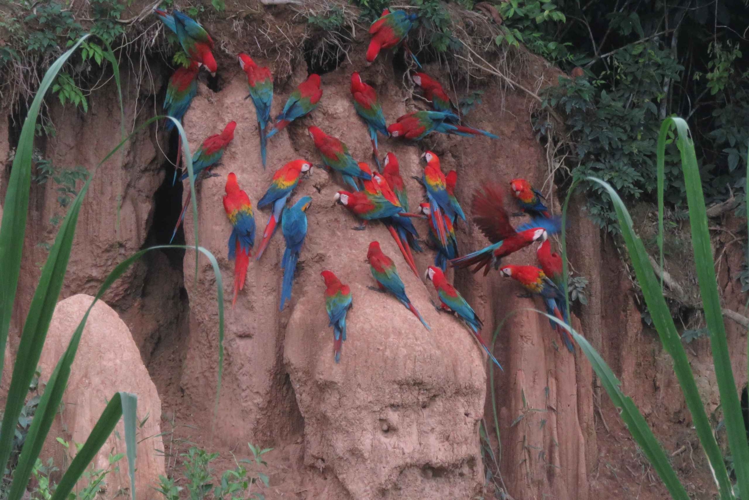 At 4:30 a.m., we'll set off by boat to explore the Tambopata River. The trip will take about 1 hour and 30 minutes. During this time, you'll be able to observe wildlife such as jaguars, tapirs, and capybaras. From there, we'll head to the Chuncho clay lick, the world's largest salt lick. In this collpa, you'll see three species of colorful macaws and three species of parrots. After observing and photographing the fauna in the salt lick, we'll head back to the hostel by boat. There, we'll have time to pack and have lunch. After lunch, we'll head to Puerto Maldonado by car. From there, we'll sail along the Madre de Dios River for about 30 minutes until we reach our second hostel: Paradise Lodge. After dropping off our belongings, we'll explore another type of forest where we can observe animals and birds, and then we'll cross the hanging bridges to appreciate another type of vegetation from above. In the afternoon, we'll do our last activity. Travelers will have the chance to cruise the Madre de Dios River in search of caimans.