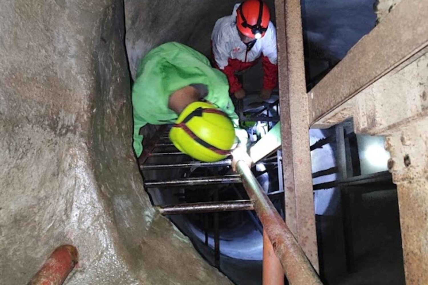 懸垂下降用安全装備 (ロープ + ヘルメット + ハーネス + 懐中電灯)。