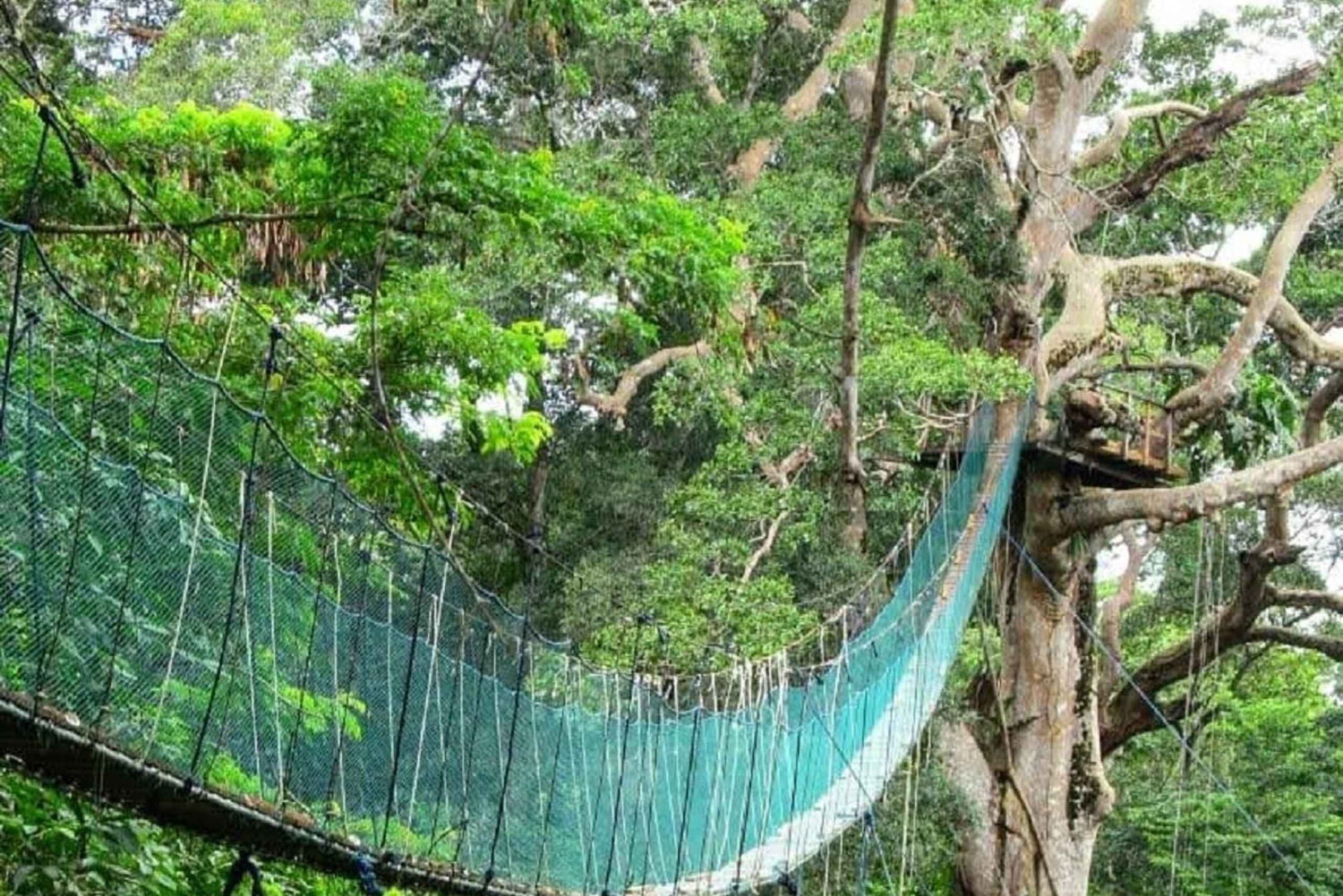 Ontdek het Amazone-regenwoud vanuit een nieuw perspectief op de Inkaterra Canopy Walkway, een van de hoogste en veiligste boomtopwandelingen in Zuid-Amerika. Begin je avontuur met een wandeling met gids door de jungle voordat je omhoog gaat naar het wandelpadensysteem dat meer dan 30 meter boven de grond hangt. Steek een reeks hangbruggen en platforms over terwijl je omringd wordt door de beelden en geluiden van het regenwoud. Spot kleurrijke vogels, apen en andere dieren die hoog in de boomtoppen leven. Onderweg legt je natuurgids het belang van het ecosysteem van het bladerdak uit en deelt hij zijn kennis over de biodiversiteit van de regio. Deze activiteit is ideaal voor liefhebbers van fotografie, vogels spotten en de natuur en biedt een zeldzame en onvergetelijke manier om de Amazone te ervaren.