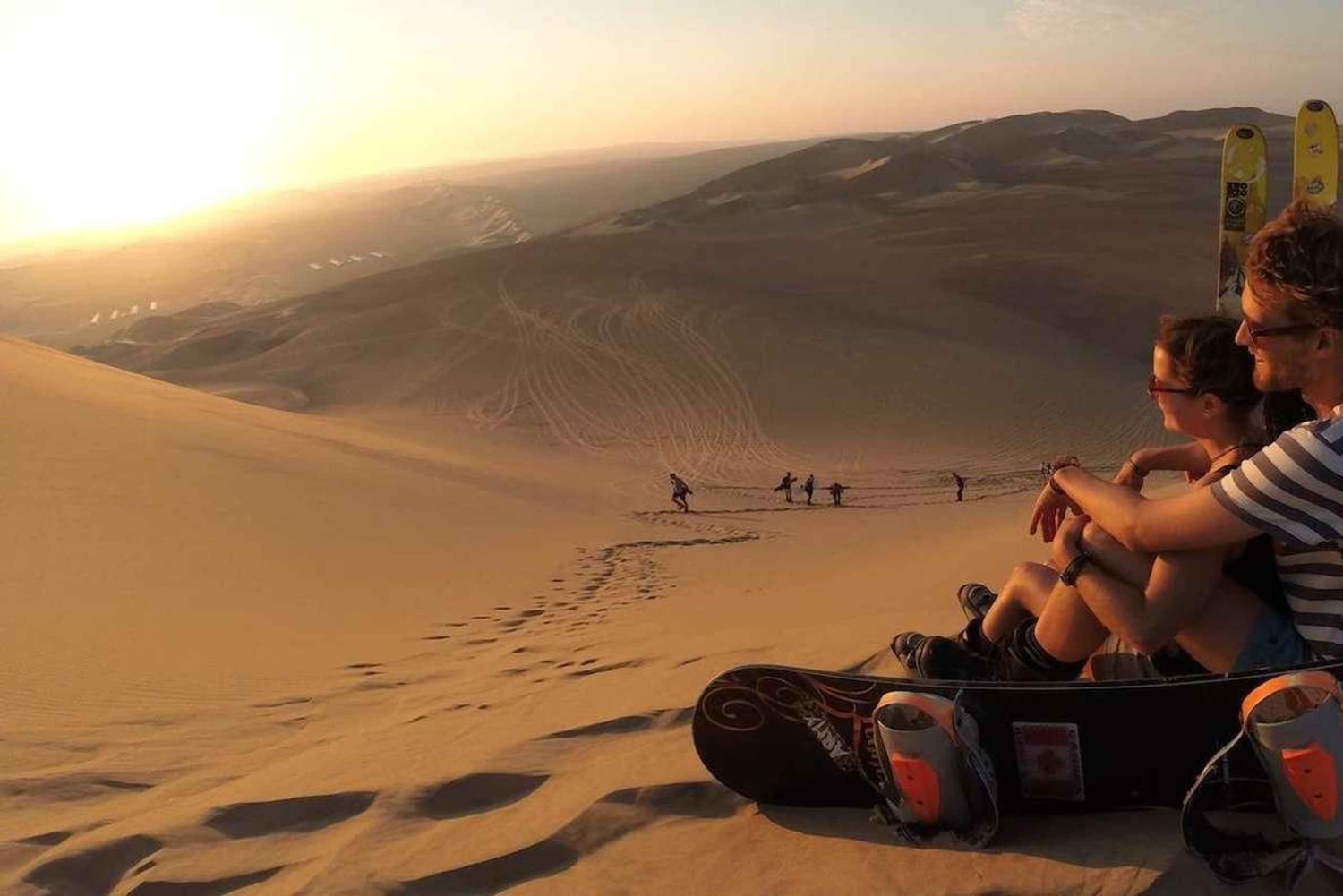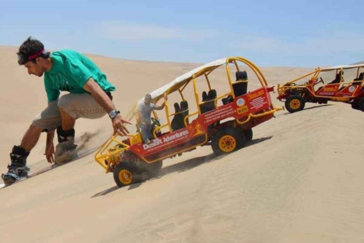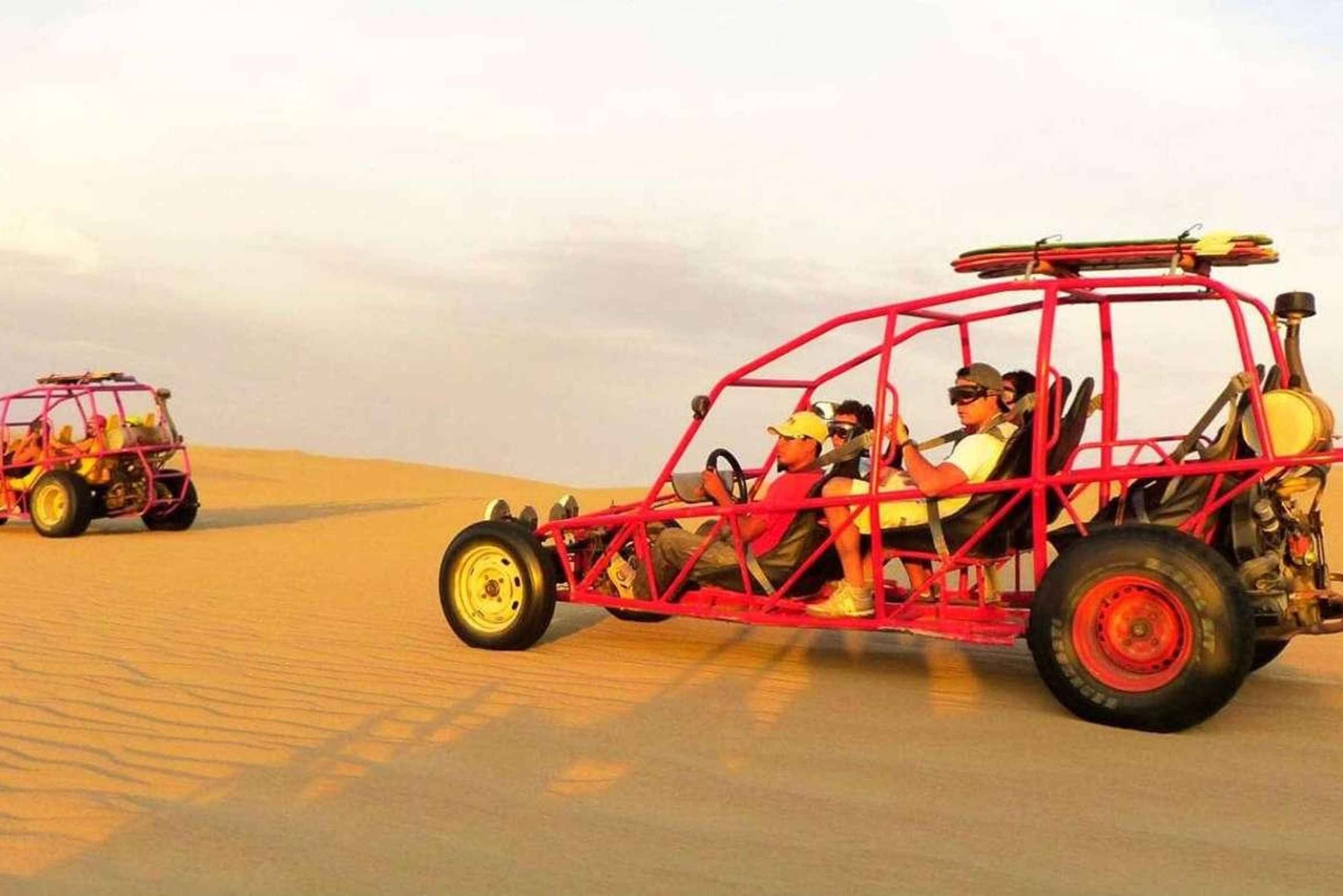 Wycieczka rozpocznie się o 16:30, spotkamy się w oazie Huacachina. Następnie wsiądziemy do buggy i wyruszymy na pustynię. Będziemy podróżować przez wydmy pustyni Ica do punktu początkowego sandboardingu, jednej z najbardziej rozrywkowych aktywności, jakie można wykonać w Ica. Wysiądziemy z buggy i otrzymamy krótkie wyjaśnienie, a następnie wsiądziemy na deski i zjedziemy z wydm.