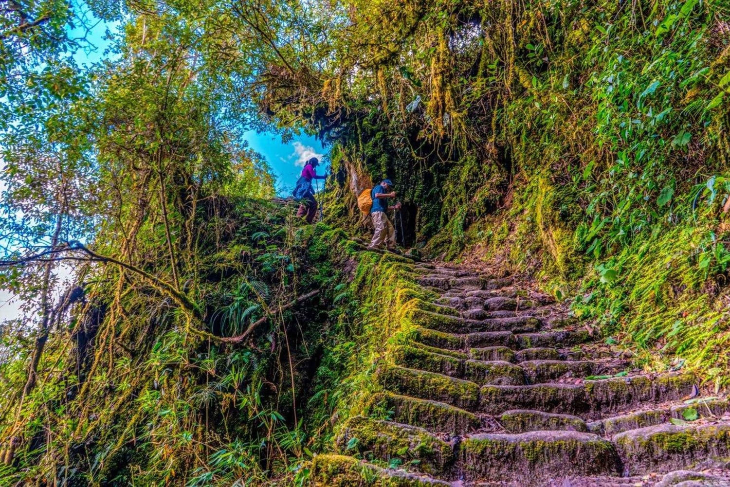 - Acampamento em Pacaymayo Dia 3: Pacaymayo – Sayacmarca – Wiñay Wayna A manhã começa com uma visita a Runkurakay (3.850 m), um sítio inca que já serviu como ponto de descanso para viajantes. Uma subida curta, mas íngreme, leva-te até a segunda passagem mais alta (4.000 m) antes de descer em direção a Sayacmarca (3.600 m), um antigo complexo inca situado em uma crista íngreme com vistas deslumbrantes das montanhas ao redor. A trilha continua por florestas nubladas exuberantes e caminhos de pedra bem preservados, passando por Phuyupatamarca (3.650 m) antes de chegar ao acampamento final em Wiñay Wayna (2.650 m), onde você passa a última noite na trilha perto de uma série espetacular de terraços agrícolas e locais cerimoniais.