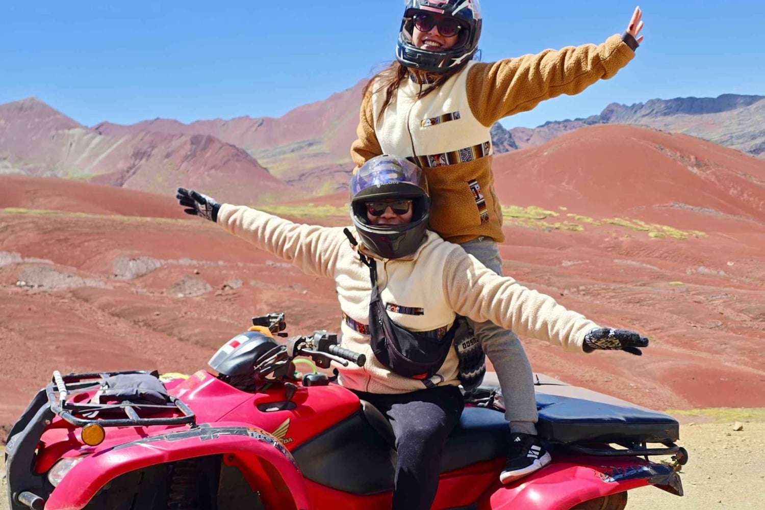 В течение 30 минут вы будете подниматься на квадроцикле в гору, проезжая открытые долины и любуясь красочными горными пейзажами. Маршрут ведет к смотровой площадке с видом на Красную долину, одно из самых ярких природных образований в этом районе.