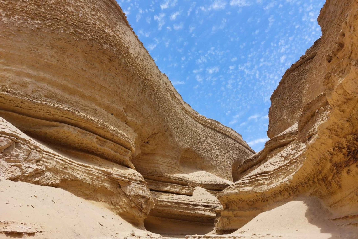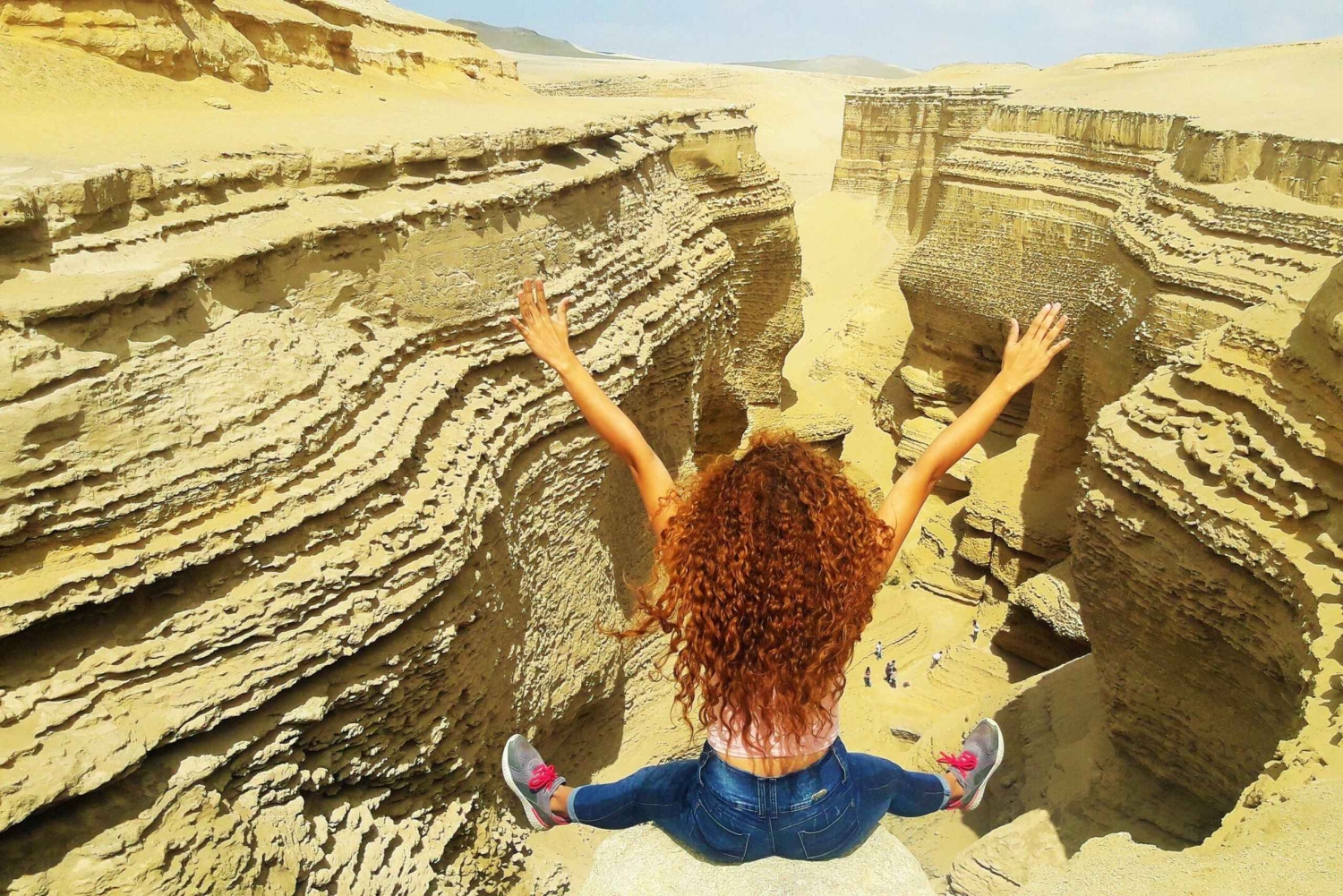 Upphämtning: Från 6:30 till 7:00 Avfärd till Lost Canyon, längs Pan-American Highway (30 minuter). Obligatoriskt stopp för att använda toaletten och köpa proviant (10 minuter). Ingång till öknen via en oasfalterad väg. Ankomst till Lost Canyon Gorge. Vi kommer att se 'La Plaza Caracol', på den 4:e nivån i 'Lost Canyon', 'La Garganta', 'La Cara del Puma'. Besök på Plaza del Ocucaje.